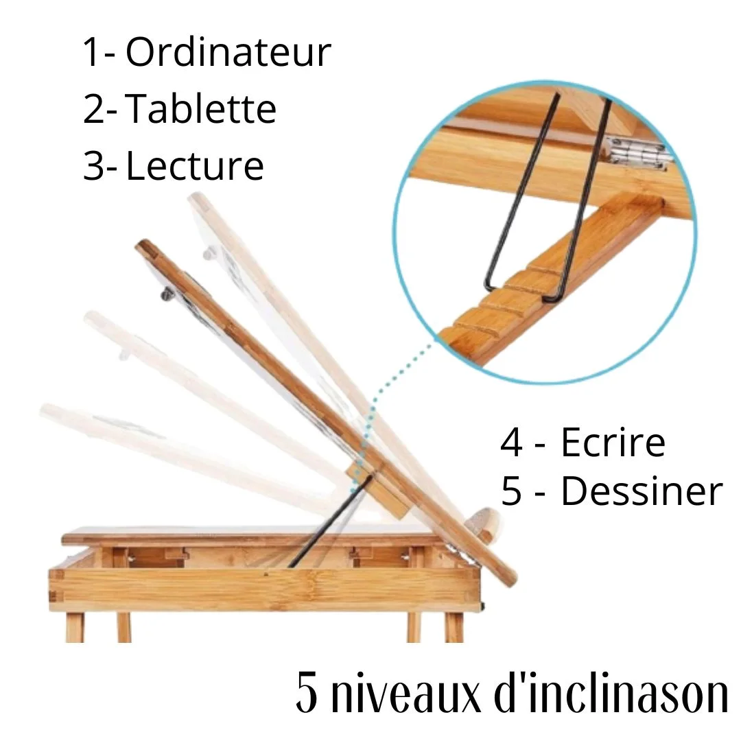 Inclinable : Inclinez le plateau réglable pour votre ordinateur portable ou Tablette sur 5 positions selon votre position préférer , pour assurer un travail confortable et ergonomique .